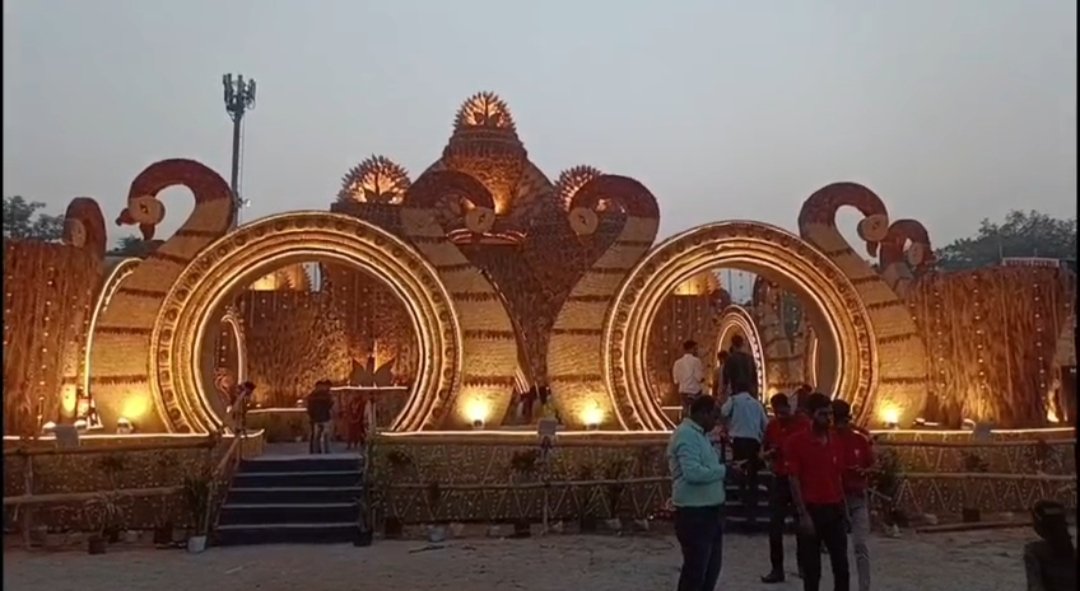 25 तरह के वेस्टेज समाग्री का उपयोग कर आकर्षक पंडाल का निर्माण कराया गया है। पंडाल बनाने में नारियल का छिलका, खजूर के छाल, मशरूम, आमड़ा के बीज, नेनुआ के छिलके आदि का उपयोग किया गया है।