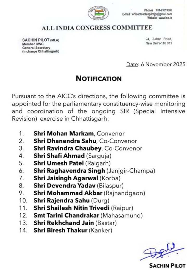 हर संसदीय क्षेत्र से एक नेता को जिम्मेदारी दी गई है। उमेश पटेल रायगढ़, देवेंद्र यादव बिलासपुर क्षेत्र के प्रभारी, मोहम्मद अकबर राजनांदगांव और राजेंद्र साहू दुर्ग के प्रभारी बनाए गए हैं। वहीं जयसिंह अग्रवाल कोरबा, शफी अहमद सरगुजा क्षेत्र देखेंगे। शैलेश नितिन त्रिवेदी को रायपुर और तारिणी चंद्राकर को महासमुंद की जिम्मेदारी दी गई है। रेखचंद जैन बस्तर और वीरेश ठाकुर कांकेर के प्रभारी बनाए गए हैं। यह समिति एसआईआर अभियान की निगरानी और समन्वय करेगी।