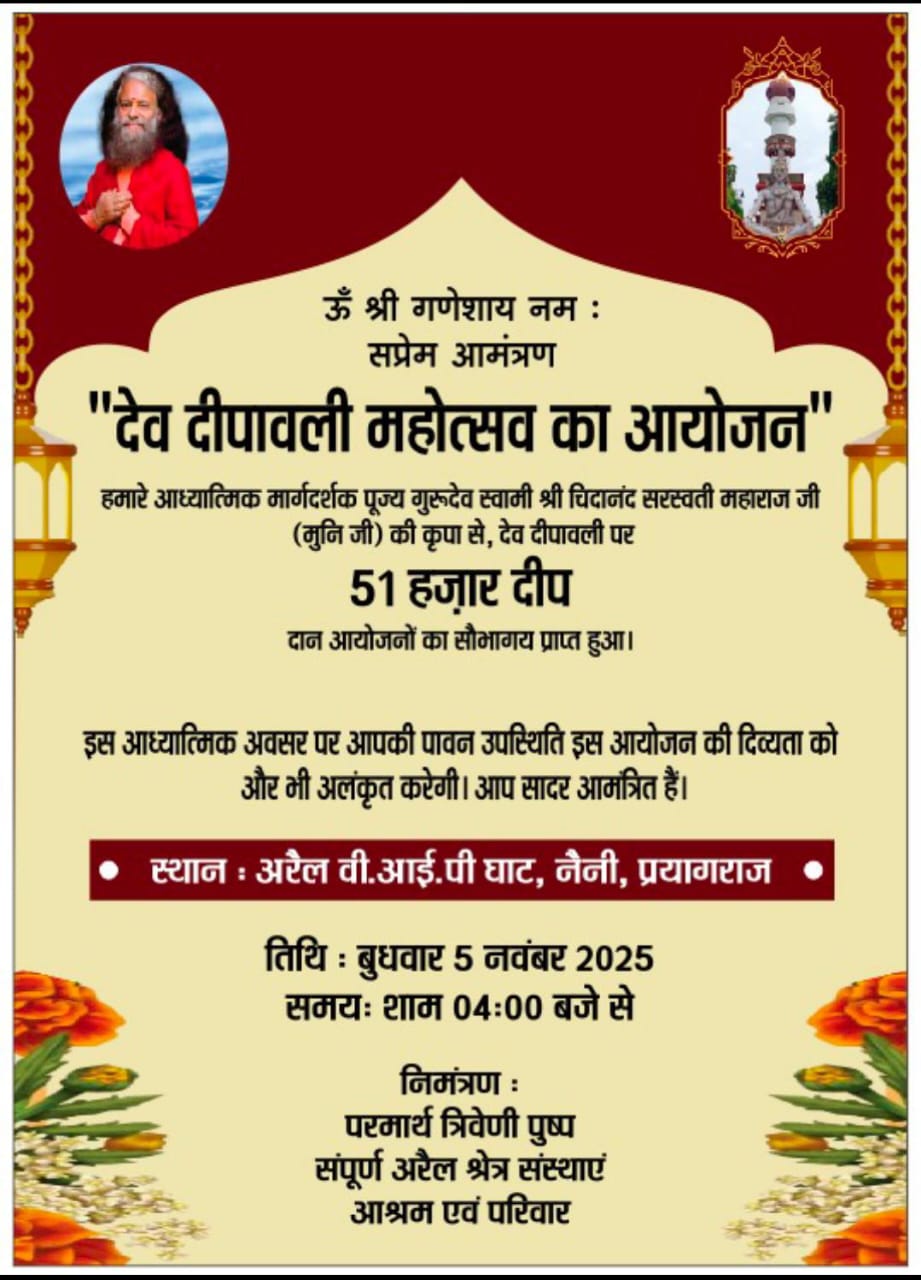 प्रयागराज, 3 नवंबर । उत्तर प्रदेश की कुंभ नगरी प्रयागराज के परमार्थ निकेतन, त्रिवेणी पुष्प एवं सम्पूर्ण अरैल क्षेत्र की संस्थाएं तथा आश्रम परिवार की सहभागिता से देव दीपावली एवं वृहद दीपदान महोत्सव का आयोजन पांच नवंबर को किया जाएगा।