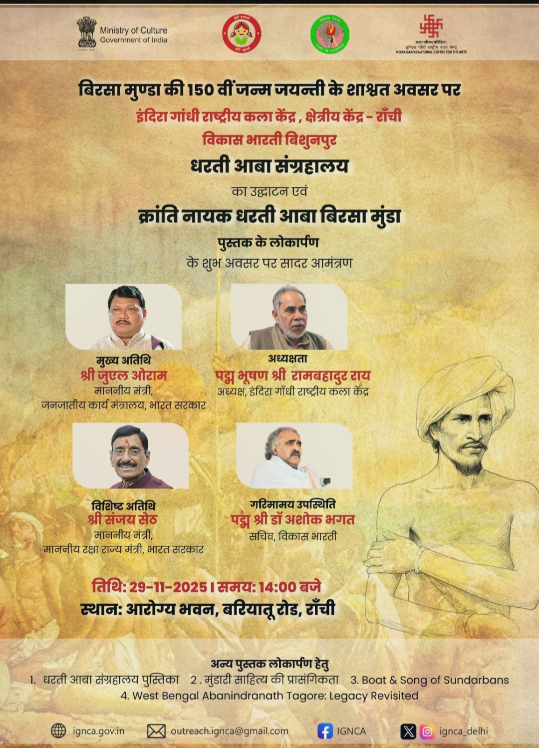 कार्यक्रम में मुख्य अतिथि के तौर पर केंद्रीय जनजातीय कार्यमंत्री जुएल उरांव और विशिष्ट अतिथि रक्षा राज्यमंत्री संजय सेठ शामिल होंगे। कार्यक्रम की अध्यक्षता इंदिरा गांधी राष्ट्रीय कला केंद्र के अध्यक्ष और पद्मभूषण राम बहादुर राय करेंगे। कार्यक्रम में विकास भारती के सचिव और पद्मश्री अशोक भगत उपस्थित रहेंगे। यह कार्यक्रम रांची के इंदिरा गांधी राष्ट्रीय कला केंद्र और विकास भारती विशुनपुर के संयुक्त तत्वावधान में आयोजित किया गया है।