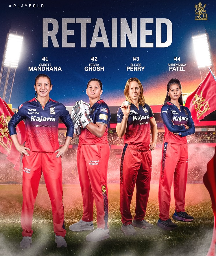 बेंगलुरु, 06 नवंबर । विमेंस प्रीमियर लीग (डब्ल्यूपीएल) 2026 के नए चक्र से पहले रॉयल चैलेंजर्स बेंगलुरु (आरसीबी) ने अपने रिटेंड खिलाड़ियों की सूची जारी कर दी है। टीम के मुख्य कोच मलोलन रंगराजन ने चार खिलाड़ियों को रिटेन करने की घोषणा की, जिनमें कप्तान स्मृति मंधाना, विकेटकीपर-बल्लेबाज ऋचा घोष, ऑस्ट्रेलियाई ऑलराउंडर एलिस पेरी और युवा स्पिनर श्रेयांका पाटिल शामिल हैं।