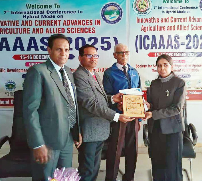 सोसाइटी फॉर साइंटिफिक डेवलपमेंट इन एग्रीकल्चर एंड टेक्नोलॉजी के तत्वावधान में आयोजित इस संगोष्ठी में रसायन विज्ञान विभाग की शोध छात्रा मनीषा जोशी को यंग अचीवर अवॉर्ड और आभा को यंग प्रोफेशनल अवॉर्ड से सम्मानित किया गया है।