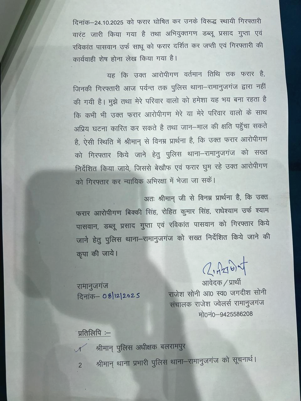 इसी को लेकर पीड़ित राजेश ज्वैलर्स के संचालक राजेश सोनी ने पुलिस महानिरीक्षक सरगुजा संभाग को पत्र लिखकर सख्त कार्रवाई की मांग की है। सोनी ने कहा कि, आरोपित लगातार फरार घूम रहे हैं और उनकी गिरफ्तारी न होने से उनके परिवार को गंभीर जान–माल का खतरा बना हुआ है।