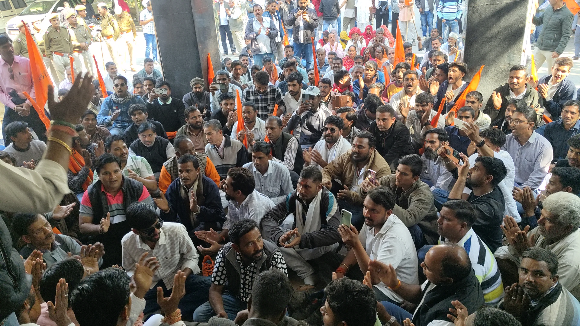 चित्तौड़गढ़, 17 जनवरी । जिले के भदेसर उपखंड के भदेसर तालाब की पाल पर स्थित भदेसर भैरूजी के प्राचीन मंदिर के समीप कब्रिस्तान को लेकर ग्रामीणों ने जमकर विरोध जताया है और कलेक्ट्रेट पर सैकड़ों की संख्या में प्रदर्शन किया। इस दौरान क्षेत्रीय सांसद, विधायक सहित अन्य लोग मौजूद रहे। ग्रामीणों ने कलेक्ट्रेट पर एक घंटे तक नारेबाजी की। इस दौरान जिला कलक्टर से मिलकर दिये ज्ञापन में बताया कि भदेसर में भैरूजी का प्राचीन मंदिर है जहां कई राज्यों से दर्शनार्थी आते है लेकिन 50 मीटर के समीप की मुस्लिम समाज का कब्रिस्तान बना हुआ है। इस 9 बीघा 13 बिस्वा भूमि का आवंटन 2010 में तीन अलग-अलग टुकड़ों में किया गया। उन्होंने ज्ञापन में बताया कि मंदिर के विस्तार और दर्शनार्थियों की सुविधाओं को ध्यान में रखकर इस आवंटन को रद्द किया जाना उचित है। ग्रामीणों ने बताया कि हाल ही में भैरूजी के मंदिर का विस्तार भी किया जाना है। ऐसे में आने वाले समय में साम्प्रदायिक माहौल बिगड़ने की भी संभावना है। वहीं उन्होंने कहा कि जनसंख्या की दृष्टि से 9 बीघा से अधिक भूमि कब्रिस्तान के लिए आवंटित करना तर्क संगत नहीं है।
