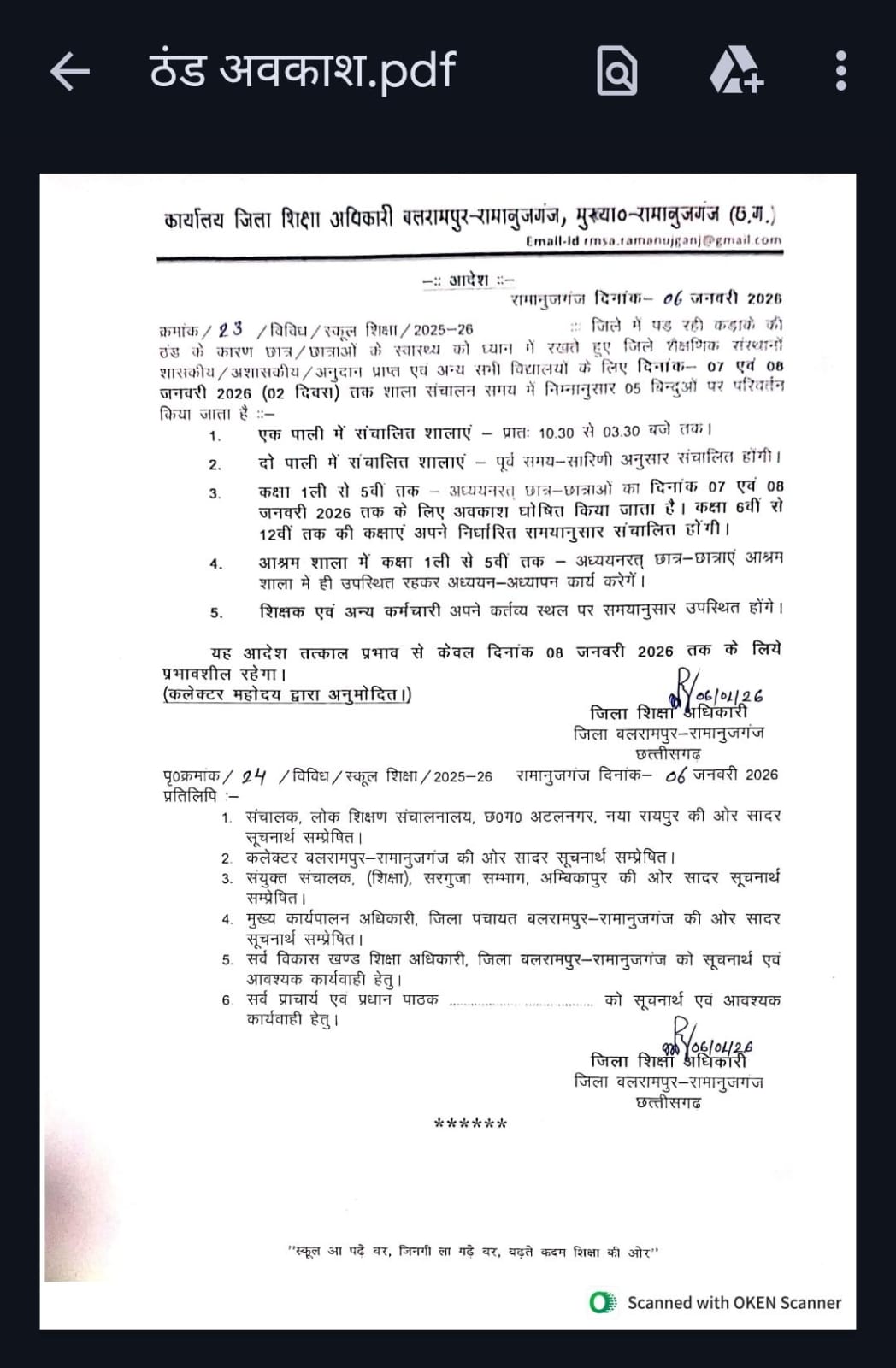 बलरामपुर, 06 जनवरी । जिले में लगातार बढ़ती ठंड और गिरते तापमान को देखते हुए जिला प्रशासन ने विद्यार्थियों के स्वास्थ्य को ध्यान में रखते हुए महत्वपूर्ण निर्णय लिया है। ठंड के प्रभाव से बच्चों को सुरक्षित रखने के उद्देश्य से जिले के सभी स्कूलों के संचालन समय में अस्थायी परिवर्तन किया गया है।