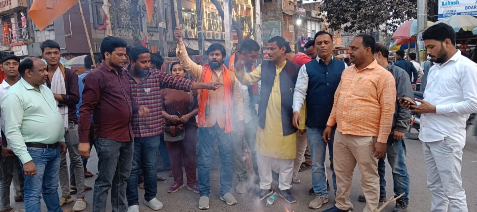 अररिया 21 फरवरी।अररिया चांदनी चौक पर भाजपा युवा मोर्चा की ओर से शनिवार को युवा मोर्चा के जिलाध्यक्ष दिव्य मूर्ति की अध्यक्षता में विरोध प्रदर्शन करते हुए राहुल गांधी का पुतला दहन किया गया।मौके पर जिलाध्यक्ष आदित्य नारायण झा उपस्थित रहे।