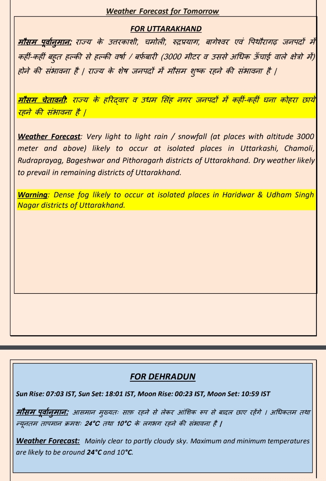 मंगलवार को मौसम विभाग के जारी बुलेटिन के अनुसार उत्तरकाशी, चमोली, रुद्रप्रयाग, बागेश्वर और पिथौरागढ़ जनपदों में कहीं-कहीं हल्की वर्षा हो सकती है, जबकि तीन हजार मीटर से अधिक ऊँचाई वाले इलाकों में बर्फबारी के आसार बने हुए हैं। राज्य के शेष जिलों में मौसम शुष्क रहने का अनुमान है।