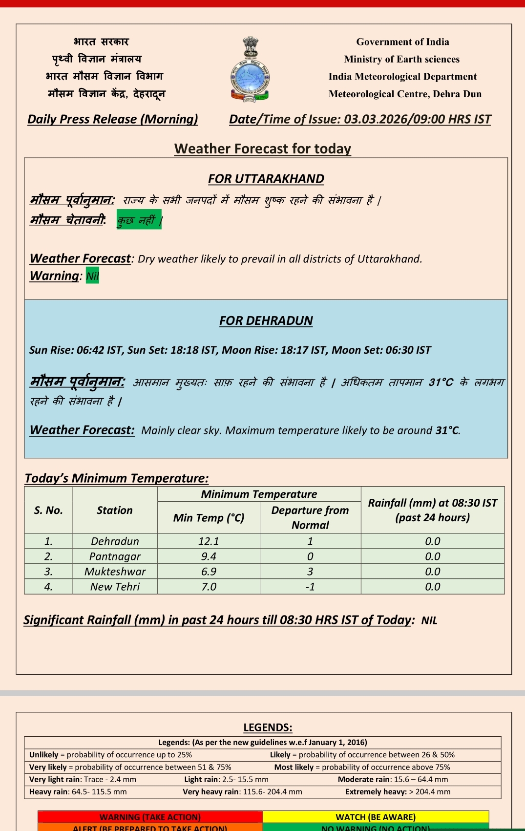 देहरादून, 03 मार्च । उत्तराखंड के सभी जनपदों में मंगलवार काे मौसम शुष्क रहने की संभावना है। विभाग की ओर से किसी भी जिले के लिए कोई चेतावनी जारी नहीं की गई है।